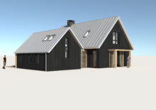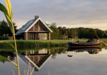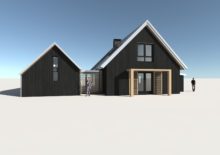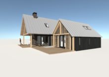 Door middel van een glazen intermediair zijn de 2 volumes met elkaar verbonden. Hetzelfde kleur en materialenpalet is toegepast; eiken houten spanten, de houten lamellen, het zwarte hout en het zinken dak. De slaapkamer geeft een prachtig uitzicht over het omringende Friese landschap.